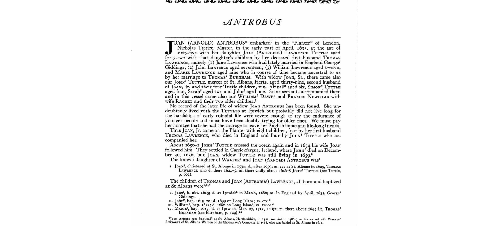 - Jane, bpt. 18 December 1614,[14][8] m. 20 February 1633/4 George Giddings at St. Albans, Hertfordshire,[8] d. 2 March 1680[/1?] at Ipswich, Massachusetts[8]